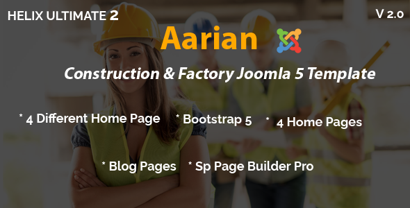Aarian Construction & Factory Base Joomla 5 Template is a perfect website and works for architecture, business, builder, building company, commercial, construction, constructor, contractor, corporate, energy, engineering, factories, factory, high tech manufacturing, industry, industrial, machinery, plant, power plant, power structure, real estate, etc.It is appropriate for clients with zero programming abilities. This template comes with necessary features for your online existence like about, blog, service, testimonial and team page etc. Aarian can be a great choice for your online existence. Aarian Joomla 5 Template Features:- 4 Home Pages