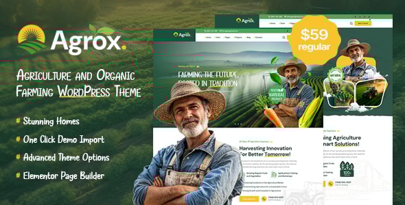Agrox is a modern and eco-friendly WordPress theme built for organic farms, agriculture businesses, livestock and dairy farms, fruit and vegetable producers, and sustainable farming projects. Whether you’re a small family-owned farm or a large agricultural enterprise, Agrox delivers a professional and clean design that connects your mission with your audience. Crafted with the powerful Elementor Page Builder, Agrox allows full customization without writing a single line of code. Build beautiful, responsive pages to showcase your farm, crops, services, team, and sustainability practices with ease. With 1-click demo import, you can launch your site in minutes using pre-built layouts designed for agriculture, farm tours, organic food, eco-products, and more. From dairy operations to vegetable greenhouses, Agrox adapts to your needs with intuitive layouts and rich content sections. It is your perfect solution for building a beautiful, functional, and future-ready agriculture or organic farm website — no coding skills needed. Key Features- Purpose-built for farms, agriculture, dairy, livestock & organic food sites