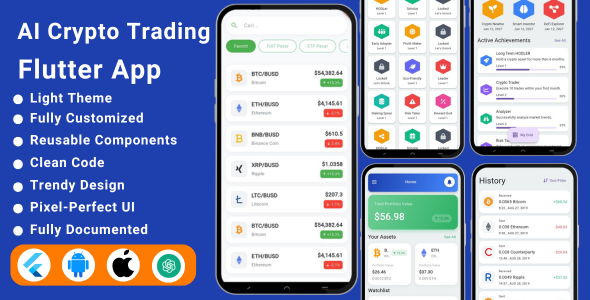 AI-Powered Will give almost all the details required AI Crypto currency App all Features like Authentication, Home(All Assets, Watch List),AI Crypto Trading, Ai Chabot, Ai Fraud Detection, Earnings, Wallet, Market, Trade, Trading Chart, Portfolio, Buy Crypto, Exchange , Watch list, Popular Crypto, Stable coin, CyrptoStatistics, History, Transaction, Activity List, Favorites, Signals, My Achievements, Transactions Help, Messages, Reviews, Settings). Everything AI-Powered was made with a detail-oriented style and follows today’s App Design trends. AI-Powered Clean coded & layers are well-organized, carefully named, and grouped. Easy customization of text, colors, graphics, and photos. 100% free fonts, perfect pixel (high-quality design), and very clean and cool UI. Free updates. AI Crypto Currency App Flutter UI Kit Features :- Supported on mobile Android and iPhone