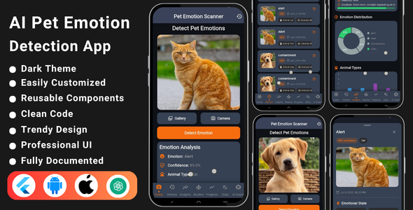 AI-Powered Pet Emotion Detection Flutter App | Pet Mood Tracker | Gemini Pet Behavior Analysis App Will give almost all the details required AI Pet Emotion Detection App all Features like Scan Image of Pet, History of Pets, Details of Pets, Pets Health Insights, AI Personalized Pets Routine, Pets Diary, Progress Tracking, and AI Pets Assistant Chat Bot Everything was made with a detail-oriented style and follows today’s App Design trends. Clean coded & layers are well-organized, carefully named, and grouped. Easy customization of text, colors, graphics, and photos. 100% free fonts, perfect pixel (high-quality design), and very clean and cool UI. Free updates. AI-Powered Emotions Detection Flutter App Features :- Supported on mobile Android and iPhone