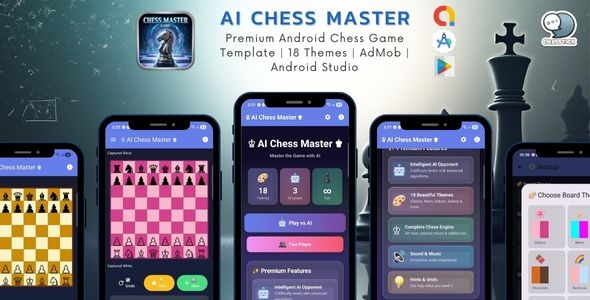Intelligent AI opponent • 10 board themes • AdMob monetization • GDPR compliant • Kotlin & Jetpack Compose • Ready to publish Bring your chess app idea to life with a professional, fully-featured Android chess game template built using Kotlin and Jetpack Compose. This package includes a complete chess engine, smart AI opponent, modern Material 3 UI, AdMob integration (banner/interstitial/rewarded), and GDPR consent flow via Google UMP. Key Features Intelligent AI Opponent- 3 difficulty levels: Easy, Medium, Hard