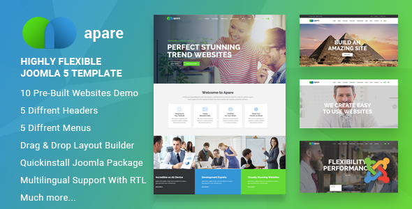 ApareJoomla 5 Responsive Template with SP Page builder Pro version is one of the best joomla templates, using drag and drop and backend-frontend edit system. Design is simple, clean and Professional and it comes with 10+ Multipage layouts, Many more inner Pages, Awesome Slideshows and Color Variations. Easy-to-customize and fully featured design. This template Created for all business such as Corporate, Business, Portfolio, Hosting, Creative, Blog, Construct and more… Apare Joomla 5 Theme Features:- 10+ Home Pages Variations