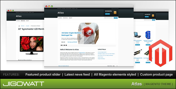 Atlas is a stylish Magento theme featuring a dynamic homepage which showcases your products with an AJAX rotating slider, latest news pulled from a feed and your standard introductory content. Beyond this all Magento elements have been styled according to the theme. The AJAX slider on the homepage is the jewel in the crown of this theme as it pulls your actual products onto the homepage. All you have to do is specify a category for the products to be pulled from. Beyond this there is a well customised category page and totally redesigned product detail page featuring a large product shot rather than the standard piddly one! )” title=” :)” />(Only For Premium Category Products !)