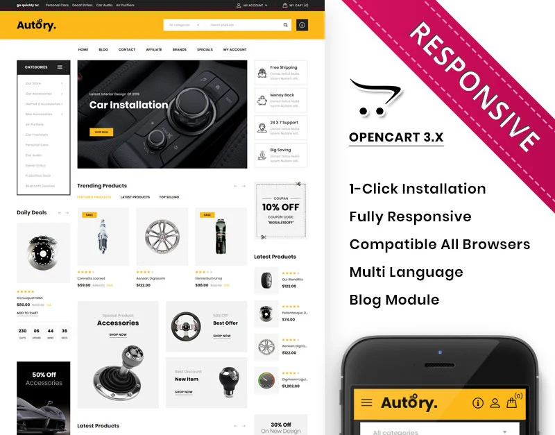 Autory - The Mega Automobile Store Responsive OpenCart Template is a premium, feature-rich OpenCart theme designed for automobile-related stores, such as those selling car parts, accessories, tires, automobile maintenance products, and even entire vehicles. The theme is built with responsiveness in mind, ensuring it looks great and functions smoothly across all devices—from desktops to smartphones. It comes with a clean, modern design, flexible layouts, and a variety of customization options to help you create a fully functional and visually appealing online store for your automotive business.