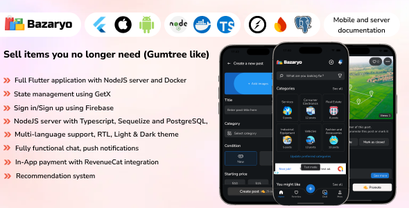 Introducing our state-of-the-art selling App, meticulously crafted with Flutter and powered by a robust NodeJS server. This dynamic application offers a seamless, user-friendly platform for participating in selling personal items, providing an engaging and secure environment. Please read the entire description before purchase. The server is written in NodeJS, using a PostgreSQL inside Docker containers Some technical knowledge might be required to add extra functionalities to the application Please read the entire documentation from here before you buy the product. I do not offer extra services to host the server on your machine. There is already a documentation for that. Features of Bazaryo mobile - Sell & Buy, Gumtree & OLX like (full application)- Create Posts: Easily create posts for a wide array of items including art, LEGO sets, cars, houses, and more.