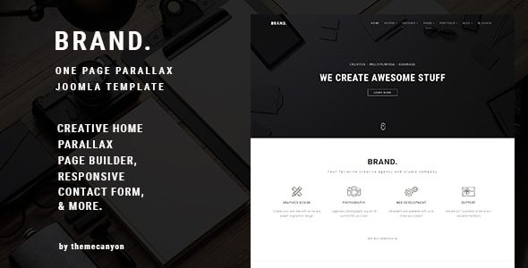 BRAND is a stylish and modern one-page parallax Joomla template designed for creative agencies, freelancers, personal portfolios, startups, and any business seeking a visually appealing online presence. Built with the latest Joomla framework, it combines clean design, smooth animations, and responsive layouts to deliver an engaging user experience across all devices.