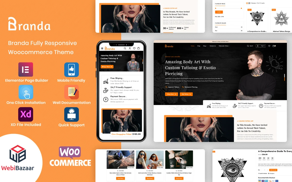 Branda – Tattoo Artist & Hair Salon WooCommerce Template is a stylish and functional WordPress theme designed specifically for businesses in the tattoo industry and hair salons. Whether you're a tattoo artist, running a tattoo parlor, or managing a hair salon, Branda provides a sleek, user-friendly, and professional platform to promote your services and sell products online.