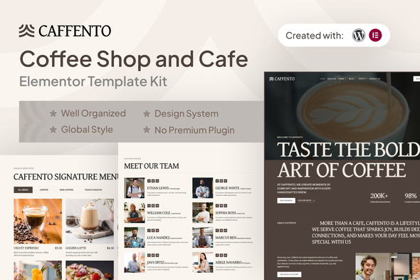 Crafted with passion for coffee lovers and cafe owners, Caffento is your ultimate solution to build a warm, inviting, and professional online presence. Powered by Elementor and WordPress, this template kit empowers you to effortlessly create a stylish website that reflects the ambience of your coffee shop or cafe. Whether you’re showcasing your menu, promoting special offers, or inviting customers to book a table, Caffento is designed to captivate your audience with its seamless user experience. With a collection of modern features tailored to the needs of cafes and restaurants, Caffento ensures your website stands out from the crowd. Enjoy clean typography with optimal readability, layouts optimized for lead generation, and a design system that guarantees consistency across all pages. Breakpoints are carefully optimized for superior user experience on any device, while extensive browser testing ensures smooth performance everywhere. Plus, practical features like One-click To Top Navigation make browsing effortless. Unlock the potential of your cafe business with Caffento’s extensive collection of 22+ meticulously crafted templates. Each template is designed to exude warmth, professionalism, and style—perfectly complementing the unique character of your coffee shop or cafe. From landing pages to menu showcases, Caffento offers a comprehensive suite of templates to streamline your website development process and help you achieve your business goals efficiently. Take your cafe’s online presence to the next level with Caffento – where design meets functionality, and hospitality meets style. Suitable For:- Coffee Shop