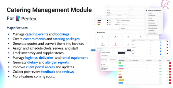 The Catering Management Module for Perfex CRM is a comprehensive solution for managing catering services. It enables businesses to handle event planning, menu creation, and package management seamlessly within Perfex. This module is designed to streamline the entire catering workflow, from initial event setup to final menu organisation, providing your team with powerful tools to efficiently manage all aspects of your catering operations. CORE FEATURES Event Management: Create, manage, and track catering events with ease. The module provides a complete event management system that allows you to organise all your catering events in one centralised location. Track event details, assign staff members, manage event types, and monitor the progress of each event through an intuitive Kanban view. Perfect for keeping your entire team coordinated and ensuring every event runs smoothly. Event Type Management: Categorise and organise your catering events by defining custom event types. Whether you’re handling weddings, corporate functions, private parties, or any other type of catering event, you can create and manage specific event types with their own characteristics and requirements. This feature helps you standardise your processes and maintain consistency across similar events. Meal Menu Management: Build and customise comprehensive menus with various items, sections, and categories. The powerful menu builder allows you to create detailed menus tailored to different events and client preferences. Organise menu items into logical sections and categories, making it easy for clients to browse and select their preferred options. Each menu can be fully customised to reflect your unique offerings. Menu Item Management: Maintain a detailed database of all your menu items with complete information about ingredients, suppliers, costs, and preparation details. Each menu item can include dietary information, allergen warnings, and dependencies on other items. Track pricing, manage suppliers, and ensure accurate cost calculations for better profitability analysis. Catering Package Management: Create and manage catering packages for different events and client needs. Bundle menu items together into attractive packages that simplify the ordering process for your clients. Set package pricing, define what’s included, and create various tiers to cater to different budgets and requirements. This feature streamlines your sales process and makes it easier for clients to make decisions. Allergen and Dietary Type Tracking: Ensure customer safety and satisfaction by tracking allergens and dietary requirements for all menu items. The module provides comprehensive allergen management and dietary type categorisation (vegetarian, vegan, gluten-free, etc.), helping you quickly identify suitable options for clients with specific dietary needs. This feature is essential for maintaining compliance and providing excellent customer service. Granular Permissions Control: Maintain complete control over staff access to module features with granular permission settings. Administrators can configure detailed permissions for events, event types, menus, menu items, and packages (View, Create, Edit, Delete). A special permission allows you to control who can view cost-related information, ensuring sensitive financial data remains secure. This flexibility ensures each staff member has exactly the access they need. More features on the way. Feel free to send through your feature request. INQUIRIES AND SUPPORT For any pre-sales enquiries, please use the discussion tab to ask any questions you may have. If you have purchased this module and require support, please open a support query, and we will be glad to assist you. For feature requests, please email us on the provided email address on our seller profile.(Only For Premium Category Products !)