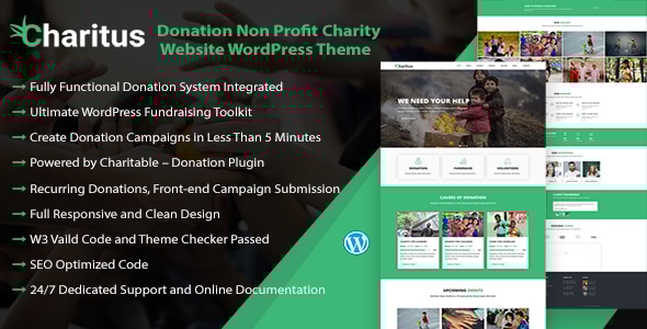 Charitus is a fully functional highly customizable online donation system charity WordPress theme powered by Charitable plugin. It has all common features what a Donation / Fundraising site should be. You can create a donation campaign in a minute. We added Give – Donation Plugin and Fundraising Platform plugin support as well to our theme. Please check this demo for give donation pages . The Charitable plugin has so many premium add-ons that allow you to extend the donation/fundraising features. Recurring Donations and Front-end Campaign Submission can be done using the premium extensions. This theme comes with all Charitable premium extensions support. This theme comes with WooCommerce and The Event Calendar support. By using this theme you can create an online store or an event site as well. Check out Charitable Plugin Extensions Charitus Key Features- Fully Functional Donation System Integrated