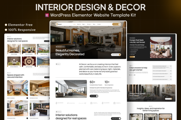 Decori is a clean and modern Elementor Template Kit designed for interior designers, home décor studios, architects, and renovation professionals. The layout focuses on clarity, spacing, and visual balance to present projects and services in a calm, premium way that builds trust from the first visit. The kit includes ready-made, fully responsive page layouts built with Elementor Free—no coding required. Easy to customize and mobile-optimized, Decori helps you launch a professional interior design website quickly and with confidence. Features:- Built with Elementor Free (No Pro required)
