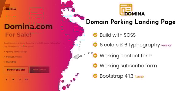 DOMINA – Domain Sale And Auction Landing Page is for creating a minimal looking domain selling and domain auction webpage. The template is made using the latest version of twitter bootstrap framework with HTML5 & CSS3. DOMINA has 5 unique template version what will help you to choose the best option for your auction or domain selling website. DOMINA has 6 different colors version and 6 different typography version. Working contact form, working local and MailChimp subscription is included. It’s responsive for all of the devices and designed with a clean look and feel, stylish & modern trend. It comes with one unique layout which includes tons of sections, customization options and features for multiple purposes. Unique Features- 5 Different template layouts
