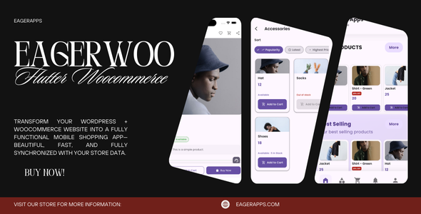 A premium Flutter mobile full app that turns your WooCommerce store into a fast, beautiful native shopping app. Built with Flutter 3.x for Android & iOS. Seamless WooCommerce REST API integration — products, variations, cart, checkout, user profiles and orders sync automatically. Modern UI & Themes Pixel-perfect ecommerce layout, product cards, sliders, Light & Dark modes, and easy theme customization. Native WooCommerce Sync Automatic sync for products, categories, variations, coupons, carts and orders via WooCommerce REST API. Checkout & Payments Works with PayPal, Stripe, COD and any WooCommerce payment plugin you already use. Push Notifications Firebase Cloud Messaging (FCM) for order updates, promotions, and product alerts. User & Account Login / Register / Social Login, profile management, saved addresses and order history. Multi-language & RTL Localization-ready with RTL support for Arabic and other RTL languages. What’s included • Full Flutter source code (Dart) • WooCommerce API connector / example configuration • Installation & configuration documentation (step-by-step) • Demo assets & sample data • Changelog & license file Requirements • WooCommerce 4.x+ and WordPress 5.x+ • WooCommerce REST API enabled • Flutter 3.x installed (SDK) • Firebase project for push notifications (optional but recommended) • Basic knowledge of deploying Flutter apps to App Store / Play Store Support & Documentation Detailed documentation is included. We also provide support via Envato item support system for bug fixes and usage questions. • Documentation: View docs • Support: Use the Envato support tab after purchase License: Envato Regular/Extended licensing information included in the package. © EagerApps / Eager — All rights reserved.(Only For Premium Category Products !)