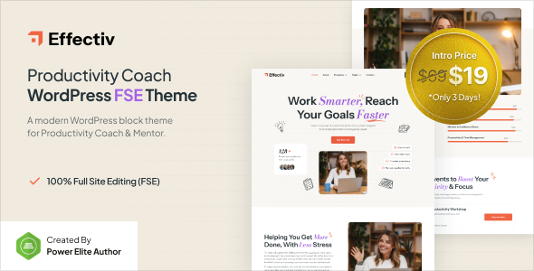 Effectiv – Productivity Coach & Mentor FSE WordPress Theme is modern and clean design WordPress theme that perfect for a Life Coaches, Business Mentors, Career Consultants, and Personal Development Programs. Fully compatible with the WordPress block editor, Effectiv makes customization effortless and provides all the essential tools to build a website that perfectly represents your business. Block Editor is more than just a page editor; it’s a powerful tool that helps you build entire websites. It makes designing and customizing your site much easier, letting you create dynamic, responsive websites without needing advanced coding skills. In today’s competitive online world, businesses and entrepreneurs face many challenges, especially when it comes to building a website that looks great, is easy to use, and works seamlessly. We believe that a good website not only reflects the brand but also keeps visitors engaged. Effectiv – Productivity Coach & Mentor FSE WordPress Theme turns these challenges into opportunities. We built this powerful WordPress block theme to simplify website creation with an intuitive Full Site Editing experience, helping you effortlessly create a website that truly stands out. Below are all the benefits you get when you choose Effectiv: Full Site Editing with Block Editor Unlock unparalleled design flexibility with the advanced WordPress Block Editor. Seamlessly drag-and-drop blocks, customize layouts, and see your changes in real time. We enhance your experience by enabling you to create and manage custom Headers, Footers, Single Posts, Single Products, Archives, and 404 Pages—all without writing any code.(Only For Premium Category Products !)