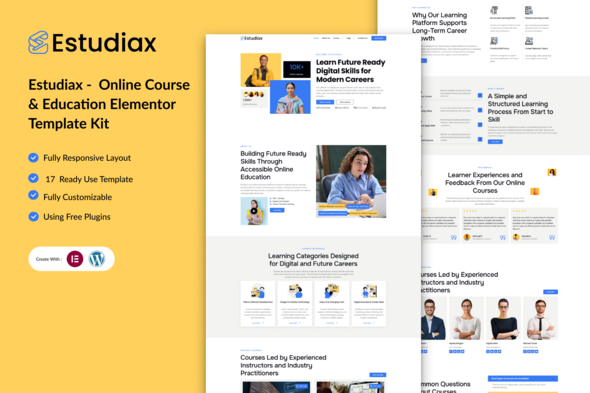 Estudiaxis an Elementor Template Kit that is is created especially for online courses, course providers, educational institutions, tutors, coaching, earning management system, college, academy, education classes, trainer, or any type of business in a education service. It features a clean and minimalist design with a modern layout style, suitable for the Elementor Free version. This kit is easy to customize and can be used by anyone without coding knowledge. Estudiax template kit includes 17 Templates and 15 Pages, allowing you to quickly create a professional-looking website. Features- Using Free Plugins : Elementor Pro is not required.