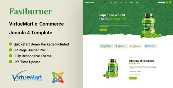 Fastburner is a premium Health & Supplement Virtuemart 4 Template designed for businesses that highly concentrate on a single category or a product itself. This is well-suitable for nutrition supplements, medical stores, weight loss, and diet product websites. The entire design style is aimed to endorse a single product sector as the sections of the website have been structured to describe the superiority of the product. Virtuemart 4 Support Fastburner offers full Virtuemart eCommerce integration with all features and page support. Every single element is styled to have beautiful look and feel and give users the best shopping experience. SP Page Builder SP Page Builder is the front-end-based Joomla Page builder which allows you to easily create, edit and modify the existing content on your website using a front-end editor. Using this page builder to customization of your website within no time. Our Fastburner Virtuemart eCommerce Template builds with SP Page builder which gives you a better experience in customization. Helix Ultimate 2 Fastburner is built by using the most popular Joomla Framework Helix ultimate 2. Which has an attractive UX, Advanced Media manager, Responsive design layout, and Multiple headers have been achieved. This means by using our fastburner eCommerce theme you have complete control over your website. you can easily customize your website. Key Features- Drag & Drop Page Builder PRO