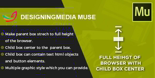 designingmedia muse presents Unique Widget for Adobe Muse – Full height with box centered for responsive as well as fixed pages website. our Widget will work with adobe muse version starting from 2015.2.x to latest. As you know, the problem of the responsive layout of the website in Muse is the lack of full height with any object to be centred to this specific dive. Now it’s no longer a problem. This widget allows you to perform this task easily by just placing the widget and provide in the graphic style.The widget is very easy to use, has 2 input fields of graphic style. Just place the widget on to the page and configure according to the instructions. Another IMPORTANT thing is that you can set multiple object to graphic style and your good to go for the full height and child container centred.result will only be applicable if the container is set to Y-axis to (0). Thank you! Do rate us if you like our effort. Features Desktop, tablet, and phone versions. Clean, Neat and Simple. Apply to shape object in muse. Make parent box strech to full height of the browser. Child box center to the parent box. Child box can contain text html objects and button elements. Multiple graphic style which you can provide. Easily customisable widget. Only for adobe Muse. Well documentation. Sources & Credits All credits included to documentation folder. Support You can support via contact form on our profile page! Thanks Thanks for interesting & purchasing our work! I hope so you like it. Please don’t forget to check our other works.(Only For Premium Category Products !)