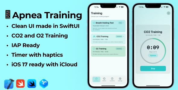 A modern and polished template built entirely with SwiftUI and SwiftData, featuring seamless iCloud sync and a highly converting paywall. Perfect for developers looking to launch a medication tracker or reminder app quickly. Features: - Breath Holding Test to check the user current stage to choose training - 4 different training plans - Detailed history view - CO2 and O2 Training with haptic feedback and sound - Working with dark mode - Built with SwiftUI – Clean, modular design using Apple’s latest UI framework. - SwiftData + iCloud Sync – Your data is stored locally and synced securely across devices. - Onboarding Screen that shows to user how to setup app, whats free tier and premium offers. - Modern Paywall with One Time Premium Purchase – Monetize your app with a built-in IAP model. - Designed for iOS 17 – Uses the latest Apple technologies and UI elements. - Beautiful and Minimal UI – Dark mode for both theme settings. - Easy to Configure & Customize – Clean code structure with comments and guidance. - No Firebase or 3rd-party dependencies – Lightweight and fully native solution. Great for indie devs, iOS freelancers, and agencies looking to save time and launch faster. Feel free to ask questions before buying Please customize the interface before submitting to App Store, because many other people buy this source code Comes with basic documentation and screenshots to help you get started.(Only For Premium Category Products !)