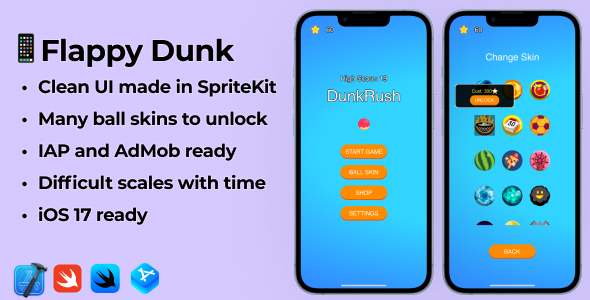 iOS 17 Swift Hypercasual Game – Flappy Dunk Clone with IAP & AdMob is a ready-to-launch iPhone game template inspired by the popular Flappy Dunk gameplay. Built using Swift 5+ and optimized for iOS 17, it offers seamless monetization and engaging mechanics.