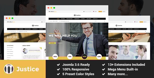 SJ Justice is a fully responsive Law Firm Joomla Template that allows you to create individual attorneys, lawyers, law firms, personal injury attorney, personal injury lawyer and for any legal and law related small business firms. With modern, clean and professional layout, this business Joomla template makes sure of your potential client to visit your site. The template comes with lots of real word features to build a law firm website such as: services, trusted attorneys, legal news, areas of practice, blog and much more. FULLY RESPONSIVE LAYOUT Based on YT Framework v3, SJ Justice will bring to customers a great look on any devices: PC, mobile, ipad… or any screen resolutions.Let experience it! MEGA MENU With mega menu you can show categories and news with description, image, video, effects… or even add links to any page, static blocks with promotion banners and modules. 5 PRESET COLOR STYLES This template is available with 5 color styles: Cyan, Orange, Yellow, Red and Green. Besides, it allows you to fully customize color schemes in back-end. YT FRAMEWORK V3 YT Framework makes it very simple for you to build, customize and handle your own website with a wide range of easy tasking features. 65+ USEFUL SHORTCODES Powered by YT Shortcode, SJ Justice comes with 65+ useful shortcodes that help you more powwerful in building and cusstomizing your site. You can easily build a various website content without much coding knowledge required. HTML5, CSS5, BOOTSTRAP 3 & LESS SJ Justice is built with new web technologies: Bootstrap 3, Awesome Google Font, LESS, CSS3, HTML5 that makes it more powerful and flexible. OTHER FEATURES-