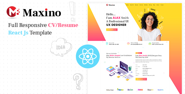 Maxino is a clean, multifunctional, highly customizable one page CV/Resume React Js Template. You can make an excellent online resume with about, skill, resume, portfolio, services, blog, pricing, client and contact section by using . This template is fully responsive, mobile-friendly, Retina-ready and bootstrap based. suitable as a vCard, creative Portfolio or personal CV and resume website for artists, designers, and job-seekers. It’s design and premium graphics look awesome on any device your employer/client uses: iPhone, iPad, Android, Mac, BlackBerry, Windows and Linux. Features- Build with React