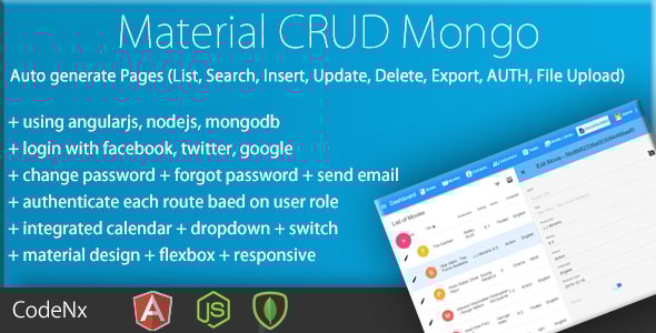 The MEAN Material CRUD is a full-stack web application that uses the MEAN stack (MongoDB, Express.js, AngularJS, and Node.js) with Material Design components to manage data through a Create, Read, Update, and Delete (CRUD) interface. This application allows users to interact with a MongoDB database in a user-friendly way using Materialized design elements on the frontend with AngularJS. CRUD generator based on Angular 1.6 + Webpack 3 A single line of code auto generates all the required html elements to perform user interactive database operations- Auto generate database admin pages with single line of code