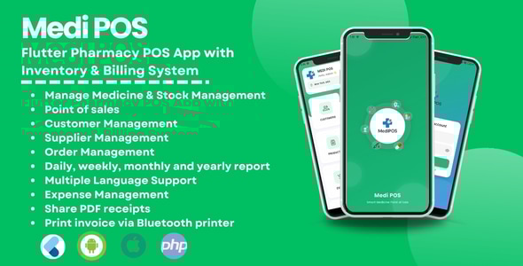Medi POS is an innovative, cloud-based Point of Sale (POS) system designed specifically for pharmacies, clinics, and medical stores. Built with Flutter for Android and iOS, it seamlessly integrates with a powerful Web Admin Panel for complete business management. Medi POS enables you to efficiently manage medicines, customers, suppliers, and sales records right from your mobile device or tablet. With intuitive controls and real-time data access, you can organize all your inventory and track performance through detailed daily, weekly, monthly, and yearly reports, beautifully displayed in easy-to-understand bar charts. The system also supports multiple languages, including English, Spanish, Bangla, Hindi, and French, making it accessible to a global audience. The flexibility to process sales directly from your Android or iOS device, combined with the robust management tools of the web panel, allows you to run your pharmacy operations smoothly from anywhere, at any time. All data is securely stored on a reliable cloud server, ensuring your business information remains safe, accurate, and always available. Medi POS is the ultimate solution for modern pharmacies looking to streamline operations, improve efficiency, and grow effortlessly. Main Features:- Create customer and supplier information.