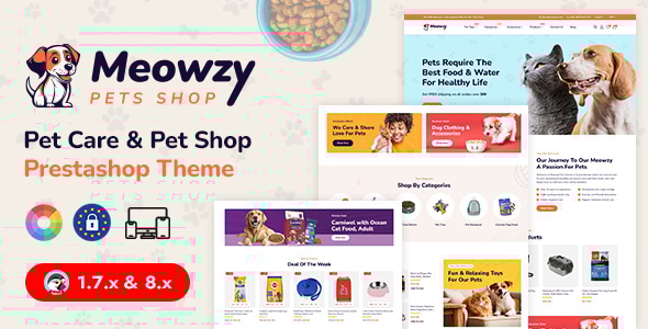 Meowzy – Pets Shop & Pet Food Store PrestaShop Responsive Theme is a charming and feature-rich eCommerce theme designed specifically for pet shops, pet food stores, veterinary supplies, and all types of pet accessories. Built on the latest version of PrestaShop 8, Meowzy delivers a modern and user-friendly shopping experience with a clean, responsive layout that adapts beautifully across all devices. This theme includes powerful AJAX features like quick view, wishlist, compare, and product add to cart for seamless interaction. With advanced product filtering, customers can easily find items by pet type, category, brand, or price range. The built-in mega menu module allows for easy navigation and flexible menu structure, while the theme settings module provides extensive customization options for colors, fonts, and layout — no coding required. Meowzy supports multiple languages and currencies, right-to-left (RTL) layout, and is optimized for SEO to help your pet store rank better in search engines. Whether you’re selling cat toys, dog treats, or bird supplies, Meowzy offers the perfect combination of design and functionality to grow your online pet business.- Bootstrap HTML5 and CSS3