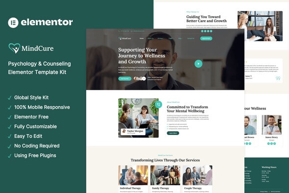 Mindcure is a professionally designed Elementor Template Kit tailored for psychology, counseling, and mental wellness services. Featuring a calm, modern, and inviting layout, Mindcure is perfect for therapists, counselors, psychologists, and wellness coaches looking to create a trusting and professional online presence. Build your therapy or counseling website effortlessly with no coding skills required—just use Elementor’s drag-and-drop functionality to customize templates to match your brand. Save time and launch your healing-centered website quickly with Mindcure. Easily edit colors, fonts, and layouts to create a soothing, client-friendly experience—all without touching a single line of code. This template kit includes pre-designed pages for use with the Elementor page builder. It works best with the free Hello Elementor theme but is compatible with most themes that support Elementor. Layout Features- Modern and Professional Design