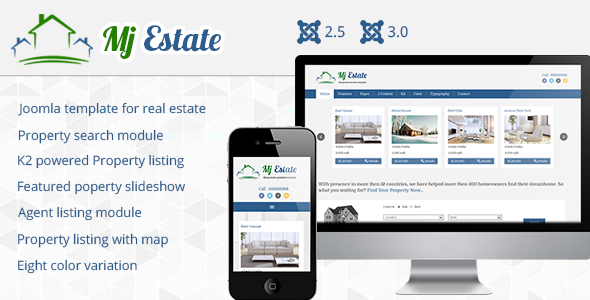 Mj Estate is responsive Real Estate joomla template based on K2 extension and designed for mobiles, tablets and desktops. It is compatible with Joomla 2.5 onwards. Display list of properties for selling and buying. Mj Estate is built using Solid grid system and Bootstrap framework. It’s suitable for Real-Estate and Property listing websites. Mj Estate Features:- Responsive HTML5 Real-Estate Joomla template