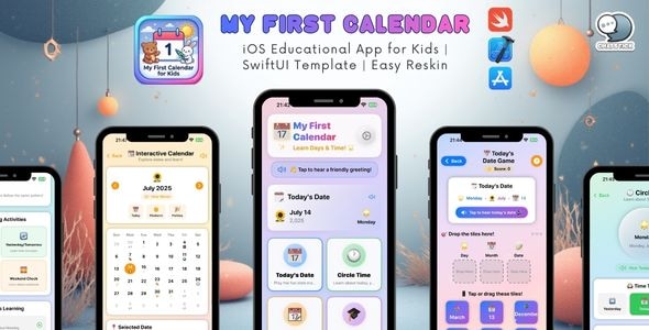 Complete My First Calendar iOS calendar-learning app with games, quizzes, and audio narration • Fully customizable • iPhone + iPad Transform calendar learning into an adventure! My First Calendar is a comprehensive, production-ready iOS app template designed to engage children in learning about calendars, days of the week, months, and time concepts through interactive games and activities. Built with SwiftUI and modern iOS development practices, this template is ideal for developers, entrepreneurs, and educators who want to launch a professional educational calendar app quickly. Key Features Interactive Learning Modes- Today’s Date Game — fun drag-and-drop gameplay to learn the current date