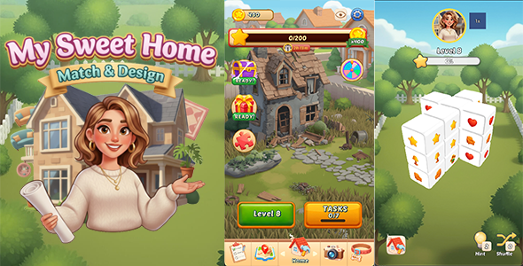 Welcome to My Sweet Home – Match & Design Dive into a captivating blend of match-3 puzzle gameplay and home renovation simulation! In My Sweet Home, you’ll help restore a beautiful home by solving engaging match-3 puzzles, completing quests, and unlocking amazing rewards. Match colorful tiles to earn gold and stars, then use them to renovate different rooms including the Kitchen, Living Room, Lily’s Room, and Garage. Watch as your choices transform a worn-down house into a stunning home, piece by piece! Complete daily challenges, unlock photo album memories, spin the wheel for prizes, solve jigsaw puzzles, and even adopt adorable pets to accompany you on your renovation journey. Key Features:- Classic match-3 puzzle gameplay with unique power-ups and boosters