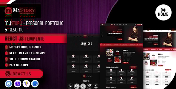 Mystory – is a modern, unique and clean Responsive React JS Template, created especially for freelancers, developers, programmers, designers, coders, and other creative professionals. Building an online resume or CV website is no longer difficult. MyStory is fully responsive, highly customizable, and features a distinctive design that helps you attract new clients and stand out from the crowd. Creating a resume, CV, or personal website with MyStory is an effective way to promote yourself and showcase your skills, experience, and work. We have included a documentation file, to guide you, All files and code have been well organized and nicely commented on for ease of customizing. Mystory is fully responsive and delivers a seamless experience across all devices, including laptops, tablets, iPads, iPhones, and Android devices. Built with clean, well-commented code, the template is easy to understand, customize, and scale—whether you’re a developer or a business owner. Our fast and friendly support team will be glad to assist with any needs with the template. Features- Includes 04+ Home versions