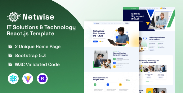Netwise is a modern React template designed for IT businesses, software development companies, and tech startups. Built with React JS (Vite) and Bootstrap 5, it delivers a seamless, high-performance user experience with fast loading speeds and optimized code—no jQuery required. This template features a sleek, responsive layout with intuitive navigation, ensuring a smooth browsing experience across all devices. Showcase your expertise in software development, network security, IT consulting, and more through dynamic, reusable components and customizable sections. Integrated Framer Motion animations bring your content to life with smooth transitions and interactive effects, making your website engaging and visually appealing. Features Overview- React JS (Vite)