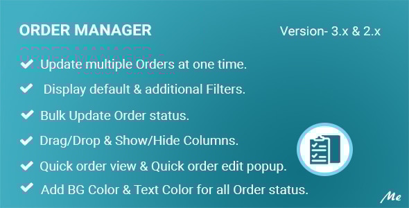 Order Manager - Full Order Management With this extension, you can manage your orders quickly and easily. This extension allows admin to edit, bulk delete, bulk update order without page loading. It saves your time as do not need to open the particular order info page. You can arrange the order columns with the drag & drop feature. We have provided some additional filters which help to filter orders easily. You can Bulk update the order status of the orders. You can copy orders in bulk. You can export all orders in an excel spreadsheet. Features:- You can Update Multiple orders at one time.