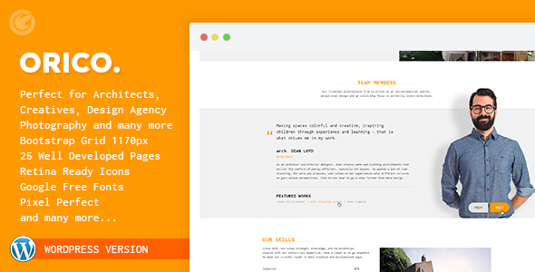About us Orico is a premium WP template designed for architectural firm, freelance architects, but it can also be used to creatively showcase your portfolio. Theme is created by using Redux framework, ready for responsive design which makes it a perfect fit for all devices. Feature List- Layout Styles