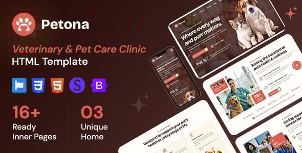 Petona is a warm, friendly and professional HTML template designed for veterinary clinics, animal hospitals, pet care centers, pet grooming services and animal healthcare providers. With three unique home page layouts, Petona gives you flexibility to present your clinic with a style that matches your brand, whether that’s a family-friendly pet clinic vibe, a modern veterinary hospital or a premium pet care center. Built on the robust Bootstrap 5 framework, Petona ensures full responsiveness and smooth performance across desktop, tablet and mobile devices. The template features clean, developer-friendly and SEO-optimized markup to ensure fast loading, easy customization and good search engine visibility. With Petona you get a complete set of essential pages out of the box, from service listings, pet care details, team/staff profiles, testimonials, contact forms, to blog/news sections and FAQ pages. This makes it easy to launch a full-featured, polished website for your pet-care business with minimal setup. Key Features- Modern & Scientific Design: Clean visuals, refined typography and data-driven layouts.
