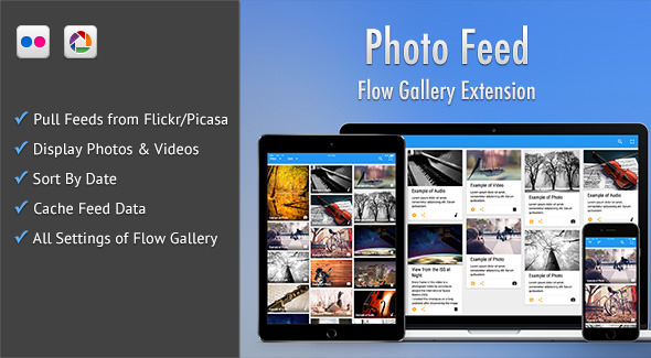 Photo Feed is an extension or add-on for the Flow Gallery jQuery plugin. Designed in conjunction with Flow Gallery, Photo Feed provides you the ability to pull feeds from Flickr and Picasa – save valuable time without duplicating uploads! Complete compatibility guaranteed. All the settings of the Flow Gallery plugin can be used with this extension.What are you waiting for – take a look for yourself!
