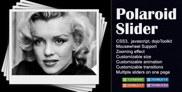 Polaroid slider mimics the feeling of the old-style polaroid photographs. It’s a powerful javascript-css slider using CSS3 and dojoToolkit. You don’t need any programming skills to implement it on your Joomla! powered website! Please note, that Internet explorer 7 and 8 are not supported yet! Features- Arbitary size – set the size as you like