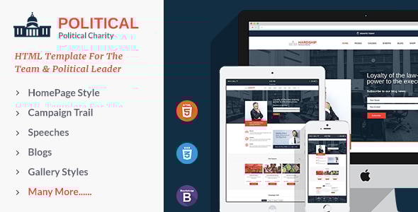 Political Responsive HTML5 Template is elegant, customization, easy, and clear HTML5 Template. Political template provides stunning features for creating Campaigns, Teams, Blogs, Events and Speach and many more for you. The template is a fully compatible for political Campaign management with every possible options. Political Responsive HTML5 Template is an actually System where you can create unlimited Campaigns for any purpose. Campaign Schedule, Descriptions, target amount with campaign members and other possible features for a campaign. It is the easiest template to set look & feel as per your choice. great feature is built in SEO compatibility which is fully compatible with latest SEO techniques. Some of the key features of the political template include: Customization background and colors options, font icons, and much more.- Responsive HTML5 CSS3 design.
