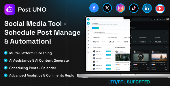 - Multi-Platform Support Connect and publish to Facebook, Instagram, X (Twitter), LinkedIn, TikTok, YouTube, etc.