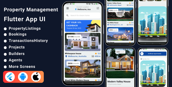 - Will give almost all the details required Property Management App all Features like Onboard,Auth,Homepage, Agents, Booking, Builders, Bookings, Projects, Listing, Saved Properties, ShortListed, Search, Favorites, Bookmark, Cost Breakdown, Dashboard, Tenant, Transaction History, Unpaid Bills, Messages, Reviews, Account Settings.