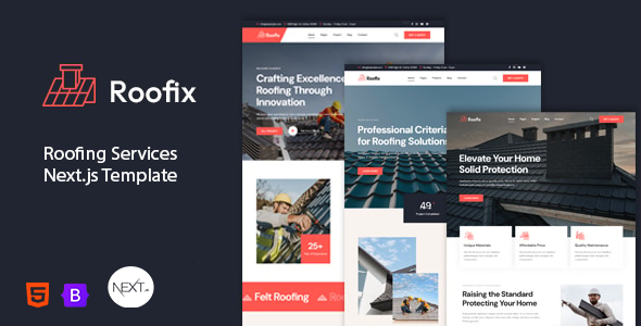 Roofix | Roofing Services Next.js Template is a Roofing Services Next JS Template. This template builds with Next JS Bootstrap-5 framework, SASS, CSS3 and No JQuery used . It’s pixel perfect design as well as lightweight and mobile-friendly. It’s also a clean, modern and minimal template that was built for all types of Roofing Services & Roof Related Companies. Feature of Roofix | Roofing Services Next.js Template:-