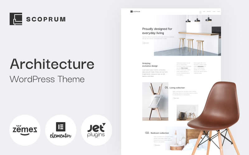 Scoprum - Furniture design WordPress theme for classy studios WordPress Theme boasts a refined and modern design tailored for furniture design studios, interior design businesses, and related industries.