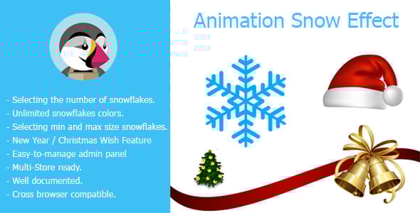This module will give your store a real holiday cheer, and bring smiles to your customers’ faces. This module adds a subtle snow effect to your website and is very simple to setup. You can easily display falling snow flakes in an appealing fashion on your shop during the winter holidays or for any other reason. Our module is the perfect for Christmas time. Adding an animation effect of falling snow is a quick and easy way to keep your site looking current during the holidays for your site’s users. Features- Super easy install and customize.