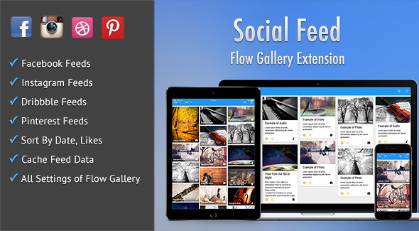 Social Feed is an extension or add-on for the Flow Gallery jQuery plugin. You’ve got a gazillion followers on Instagram, Facebook, Pinterest & Dribble and you want to use them in Flow Gallery, right? Social Feed is the solution, providing you the options to pull feeds automatically from these Social Media giants, all 100% compatible with Flow Gallery. All the settings of the Flow Gallery plugin can be used with this extension.What are you waiting for – take a look for yourself!