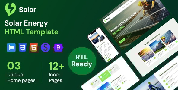 Solor – Solar Energy HTML Template is a clean, modern, and eco-friendly website template designed for solar energy companies, renewable energy providers, and environmental businesses. Built with HTML5, CSS3, and Bootstrap, it offers a professional layout that allows organizations to present their services, projects, and sustainable solutions effectively.