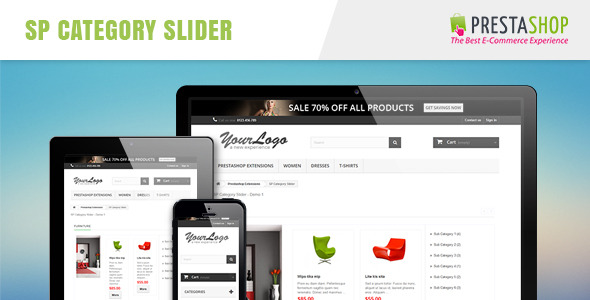 SP Category Slider is a responsive Prestashop module made to help you show any category with products and sub-category in the impressive way. Left side display nice image of main category and right side show all sub-categories. Along with variety of professional effects for displaying products on frontpage, attracting more visitors has become easier than ever. Moreover, the aim of reducing the square of needed information-showing and providing a quick overview of products to proper audiences, products in a main category to be represented as a slider. You can totally control how many products to show on each slide, it depends on you. Specially, the user friendly back-end lets you easily and absolutely control any product’s parameter. With modern layout, the module can show any product with high-quality images, title, description, price and many more criteria. In addition, the module supports touchswipe, this help user easily scroll the slider with your fingers. MAIN FEATURES:- Support Prestashop 1.6.1.x