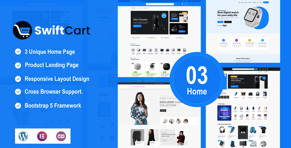 SwiftCart - Multipurpose WooCommerce WordPress Theme is a top-tier WordPress theme crafted specifically for contemporary e-commerce platforms and online retail stores. This theme seamlessly combines visual appeal with robust functionality, offering a sleek, responsive design that beautifully presents your products on any device. With flawless WooCommerce integration, customizable product layouts, and an optimized checkout process, SwiftCart ensures a professional and user-friendly shopping experience that effectively turns visitors into customers. The theme provides multiple homepage layouts, diverse product display options, and customizable header/footer styles to align with your brand’s identity. Why Choose SwiftCart - Multipurpose WooCommerce WordPress Theme? Elementor Page Builder: We utilize the highly popular Drag & Drop Elementor Page Builder plugin, an exceptional visual page builder for WordPress that allows you to effortlessly configure and organize your page layout and content. Modern Theme and Customizer Options: SwiftCart boasts a captivating modern design that not only grabs your audience’s attention but also enhances your brand’s credibility. The Customizer options are seamlessly integrated, enabling you to easily adapt the theme to your brand’s unique identity and style. Effortless Installation & Setup: Install the theme swiftly via WordPress upload or FTP, and use our convenient 1 Click Demo Importer to set up demo pages, posts, widgets, theme options, and more. Setup is incredibly straightforward! Contact Form 7: We have integrated the Contact Form 7 plugin for contact forms, pre-configured for your convenience. You can also create custom forms as needed. One-Click Demo Importer: This invaluable feature allows you to import a live preview with just one click, letting you focus on adding content and customizing the design rather than starting from scratch. Responsive Layout: SwiftCart features a responsive layout that adapts to any screen size, ensuring perfect content display on all devices, from large desktop monitors to mobile phones and tablets. Features of SwiftCart - Multipurpose WooCommerce WordPress Theme- 3+ Unique Homepages Ready