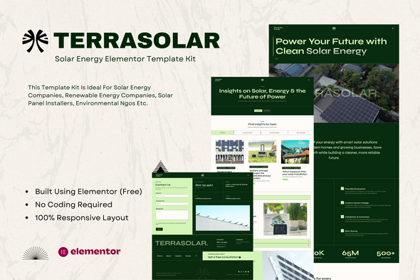Terrasolar - Solar Energy Company Elementor Template Kit Is A Elementor Template Kit Designed Specifically For Solar Energy Industry Websites. This Template Kit Is Ideal For Solar Energy Companies, Renewable Energy Companies, Solar Panel Installers, Environmental Ngos Etc. Elevate Your Online Presence With Ease And Professionalism. This Is Not A Wordpress Theme. Template Kits Contain Page Content For Elementor Page Builder. This Kit Has Been Optimized For Use With The Free Hello Elementor Theme But May Be Used With Most Themes That Support Elementor.Template Features: